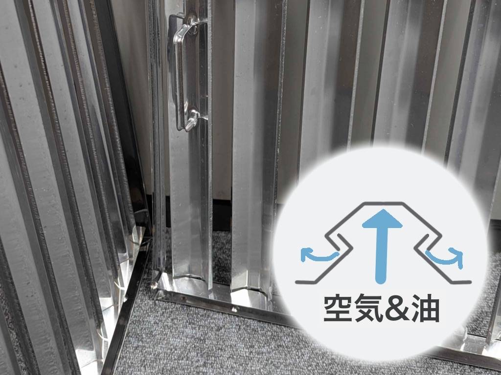 隙間が空いているので排気される空気の流れに乗っかって油脂や汚れがダクト内に侵入しやすいです。捕捉されなかった油がダクトや排気ファンの汚れの原因になってしまい、汚れが原因で防火ダンパーが動かなくなる懸念も。洗浄の際はパーツ分解が必要で角が多く洗いづらい