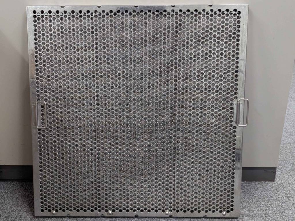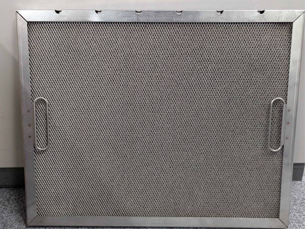 厨房のコンロ上に設置されているフード内に取り付けられた金属製の排気フィルターです。