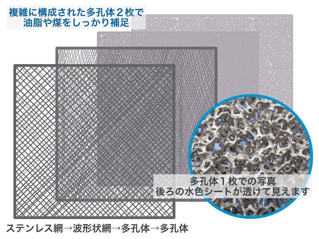 三次元網目上の金属多孔「セルメット」をベースにステンレス網を前面に組み合わせた不燃素材のフィルター。多孔体素材が複雑に配置されていて汚れを多く捕捉。空孔率(隙間の大きさ)94%と空気の流れが十分確保されているので通気性抜群・目詰まりがしづらい
