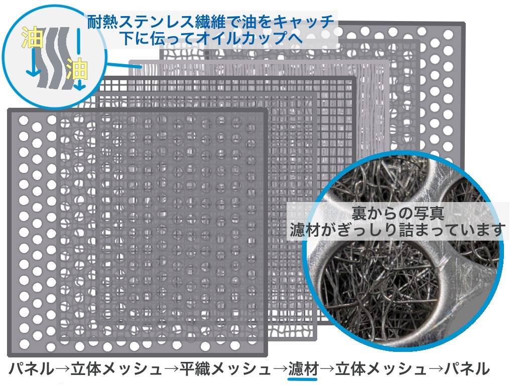 耐熱ステンレスから製造した極細繊維(1,200度の耐熱性)でできており火に強い。繊維が縦方向で編み込まれているので捕捉した油脂分が重力の影響を受け繊維に沿って流れ落ち、油受け(オイルカップ)に油が溜まる。繊維部分の滞留が少ないので長期間グリスフィルターの性能を維持できる