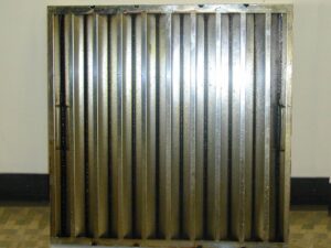 一か月使用された厨房排気フィルターの写真です。左がバッフルフィルター、右は高性能グリスフィルター(プラスワンフィルター)